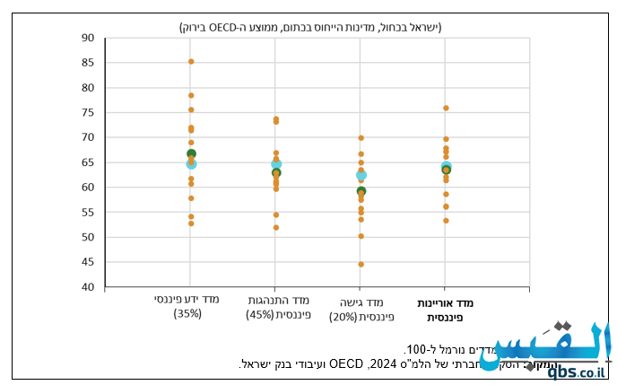 الثقافة المالية هي القدرة على فهم المسائل المالية، والتصرف بشكل صحيح مالياً، والتحلي برؤية تساعد على اتخاذ قرارات حكيمة، والادخار الفعال، والتعامل مع الأزمات الاقتصادية. لذلك، من المهم فهم الفجوات الموجودة في مستوى الثقافة المالية لدى الفئات السكانية المختلفة في إسرائيل ومقارنتها مع العالم من أجل وضع سياسات لتحسين الوضع وتعزيز الثقافة المالية للسكان. يقدم تحليل جديد أجراه كل من سيفي باخار، والدكتورة مايا هاران روزن، ورمسيس جيرا من بنك إسرائيل تقييماً محدثاً لمستوى الثقافة المالية للسكان البالغين في إسرائيل لعام 2024 يستند على فصل خاص في المسح الاجتماعي لدائرة الإحصاء المركزية ومنهجية منظمة التعاون الاقتصادي والتنمية OECD. يعتمد التحليل على منهجية منظمة التعاون الاقتصادي والتنمية المحدثة (2023) ويدمج ثلاثة مكونات – المعرفة المالية (35%)، والسلوك المالي (45%)، والموقف المالي (20%) – في مؤشر إجمالي (0-100). يبلغ المؤشر العام للثقافة المالية في إسرائيل 64 نقطة، وهو مماثل لمتوسط دول منظمة التعاون الاقتصادي والتنمية OECD (الشكل 1).