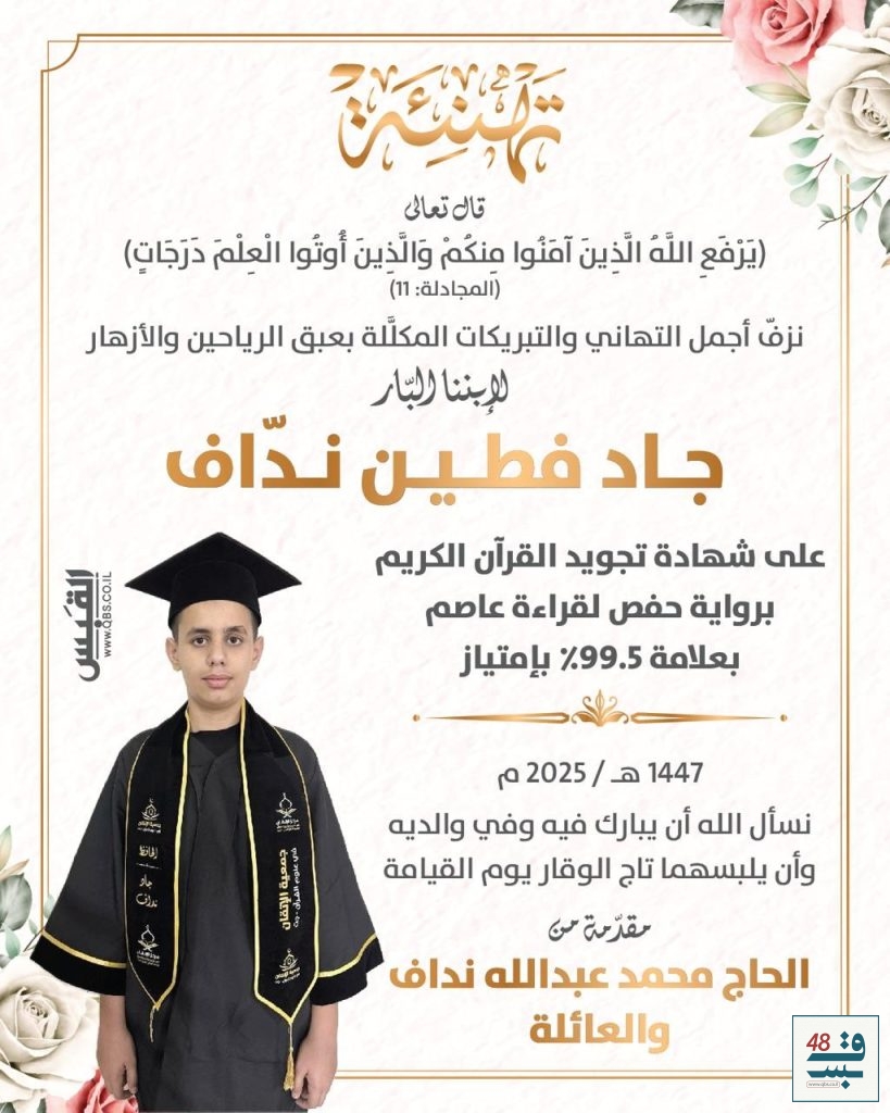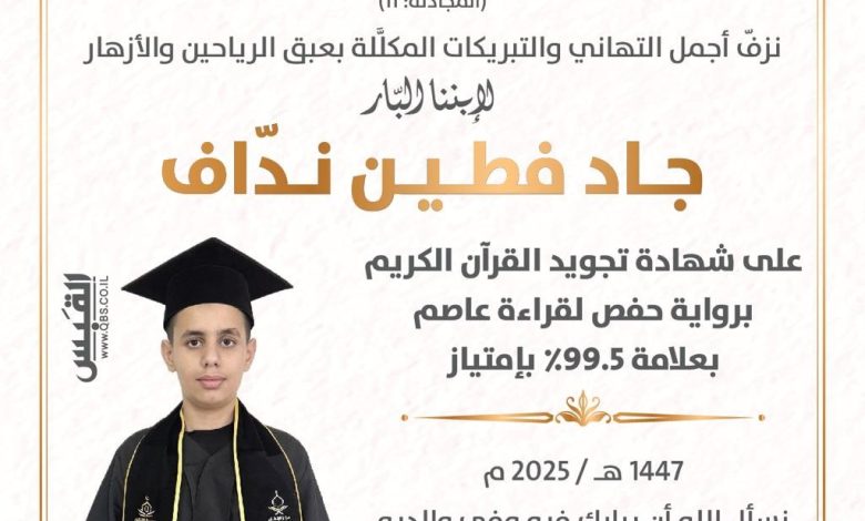 تهاني ومناسبات تهنئة مقدّمة للطالب المتميّز جاد فطين نداف طاقم التحرير08/11/20250 0 أقل من دقيقة طاقم التحرير08/11/20250 0 أقل من دقيقة فيسبوك تويتر لينكدإن Tumblr بينتيريست Reddit VKontakte مشاركة عبر البريد طباعة