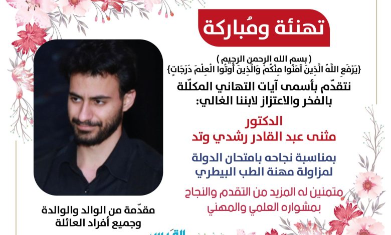 تهاني ومناسبات تهنئة مقدّمة للدكتور مثنّى عبد القادر رشدي وتد طاقم التحرير22/10/20250 0 أقل من دقيقة طاقم التحرير22/10/20250 0 أقل من دقيقة فيسبوك تويتر لينكدإن Tumblr بينتيريست Reddit VKontakte مشاركة عبر البريد طباعة